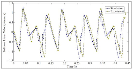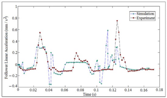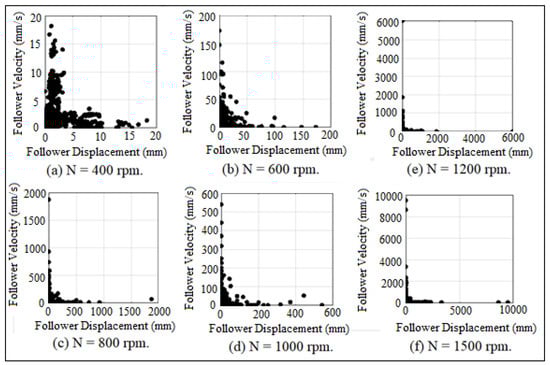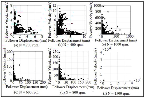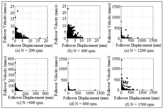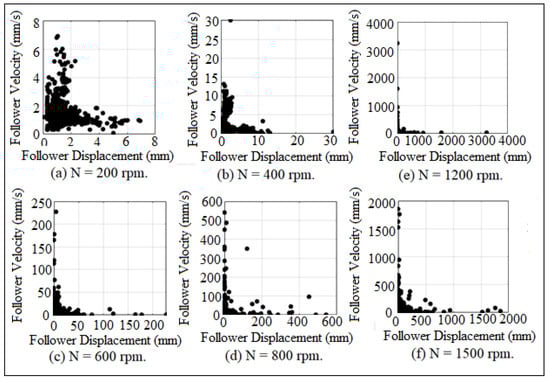 The jumping phenomenon started at critical operating speed (N = 212 rpm) in which the cam lost the contact with the follower. The critical operating speed of the cam was calculated by equating the summation of the weight and the spring force with the inertia force of the follower, []. The impact between the cam and the follower was considered based on impulse and momentum theory because the impact velocity was illustrated in the following equation: