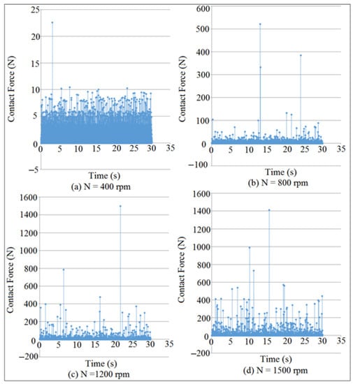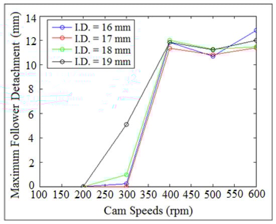 The weight of the follower was sufficient to maintain the contact when the follower moved with simple harmonic motion. Moreover, the preload spring between the installation table and the follower stem must be properly designed to maintain the contact. Figure 14 and Figure 15 showed the mapping of contact force against time for internal distance of the follower guide (I.D. = 16 and 17 mm) at different cam speeds (N). The detachment height was varied with the variation of the contact load value. The detachment occurred between the cam and the follower when the value of the contact force was in a minimum value, as indicated in Figure 14b–d and Figure 15b–d. There was an intangible detachment when the follower slipped off the cam as indicated in Figure 14a and Figure 15a at (N = 400 rpm and 200 rpm). In general, the detachments between the cam and the follower was increased when the contact force was in minimum value. SolidWorks program was used in the calculation of contact force at different (I.D.) and (N).