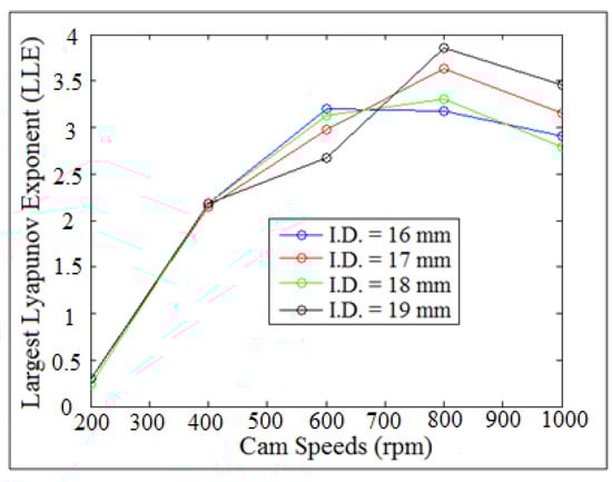 Figure 18 showed the numerical value of largest Lyapunov exponent against number of samples at (I.D. = 16 mm) and (N = 400 rpm). The value of Lyapunov exponent parameter was taken at its respective equilibrium point. One column of the contact force with the values of time delay and embedding dimension were used in Wolf algorithm to extract the numerical value of largest Lyapunov exponent parameter. One column of the contact force has been taken from the SolidWorks program where it was used in the dynamic tool of Wolf algorithm code. When the value of largest Lyapunov exponent is positive and above zero, it gives the indication that there will be a detachment between the cam and the follower.
