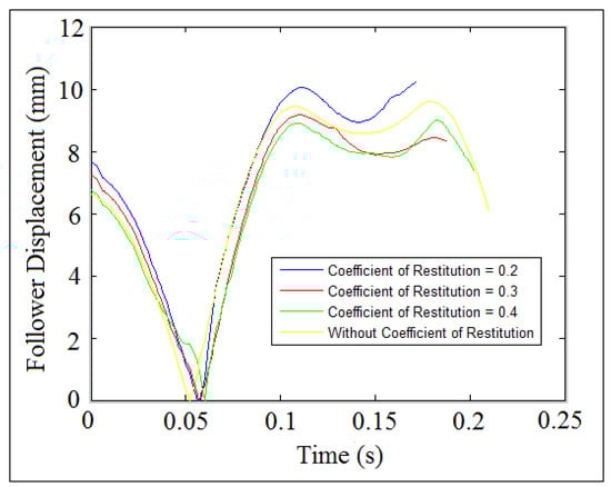 Follower linear displacement mapping against time at different values of coefficient of restitution.