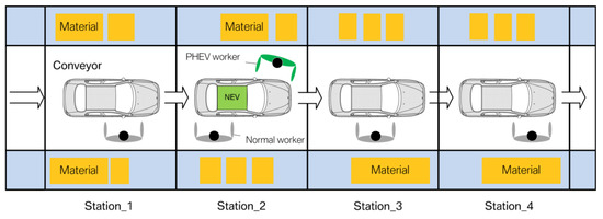 When calculating the number of PHEV workers and jolly workers, it is necessary to consider the situation when the greatest demand occurs. Therefore, the time span starts from the Kth cycle to the end of the (D + K − 1) cycle period. Within this range, it can be ensured that each station has one vehicle undergoing its assembly operations, and this time span fully takes into account the sequence combinations of vehicle models that may appear in the production area. From K to D cycle, the number of jolly workers required for overloaded stations must satisfy the constraint (21). From D + 1 to D + K − 1 cycle, the number of jolly workers required for overloaded stations must meet the constraint (22). Constraints (23) ensure that PHEV operators on the production line can finish all the specific parts’ installations for any given vehicle sequence from K to D cycle. Constraints (24) guarantee that all the specific PHEV tasks can be covered by the PHEV workers from D + 1 to D + K − 1 cycle. In the sequencing model, it must make sure that the number of each vehicle model in the sequencing result can match that value in the MPS set (25). Constraint (26) ensures the rationality and feasibility of sequence solution that only one vehicle model is assigned to each position.