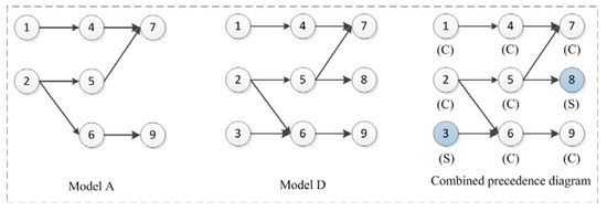 Precedence diagrams of Model A, Model D and the combined diagram in problem P9.