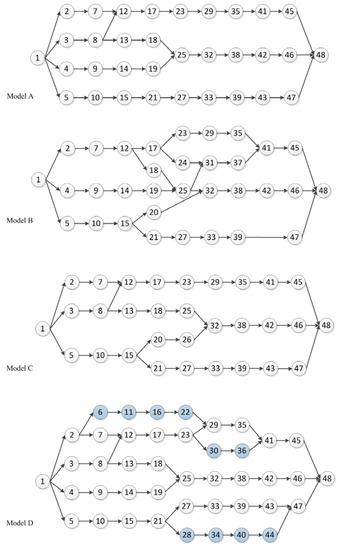 Problem P48 is constructed with reference to Problem-3 of Defersha and Mohebalizadehgashti [2]. Four models, which are Model A, B, C and D, are redesigned in problem P48. Model A, B and C are normal gasoline cars. Model D is defined as the PHEV model with specific PHEV task 6, 11, 16, 22, 28, 30, 34, 36, 40 and 44. The operation time of each task in each model is presented in Table 6. The precedence diagrams of four models are shown in Figure 6. Three production mix, which are Models A, D, Models A, B, D and Models A, B, C, D, are investigated in problem P48. The cycle time is set as 12, 14, 16, 18 and 20 for testing each proportion scenario. Since there are forty-eight tasks and four different models in problem P48, it is a large-sized mixed integer programming problem. The time limit of Gurobi solver is set as 300 s. A current best feasible solution is returned when this limit is reached.