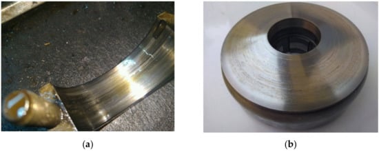 Typical damage types that occur on the working surfaces of machine parts: (a)—surface of the crankshaft-connecting rod bearing; (b)—variator’s disc surface.