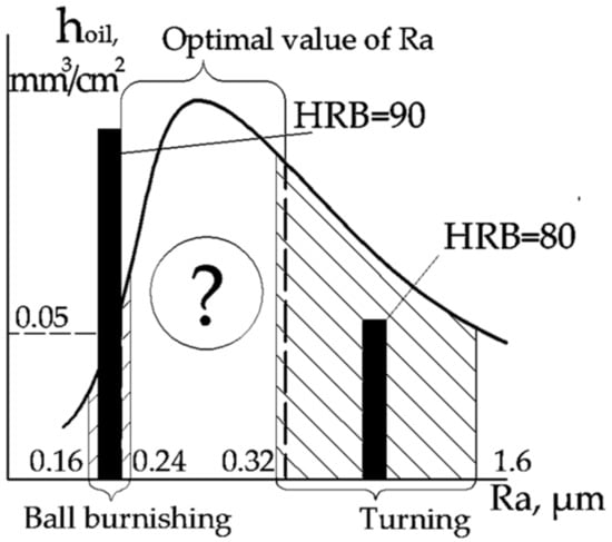 As follows from the results summarized in Table 1, the numerical value of the surface roughness parameter is not directly dependent on the performance characteristics of the surface, in particular, its oil-absorption power. Thus, surfaces with a higher numerical value of roughness (Ra = 1.114 μm) have the best oil-absorption power (V0 = 0.093 mm3/cm2). It should also be noted that during the exploitation of conjugate surfaces, their topography will change and, accordingly, their roughness will decrease to a specific value. The surface’s wear will also affect the amount of oil V0 that the surface can hold. This value will decrease until the tribological system switches to the limit friction mode []. Therefore, when choosing the finishing operation of the technological process, which will form the service properties of the machined surfaces, it should be borne in mind that the oil-absorption power of the surface must remain in a given range of values within the specified service life of the part. We should emphasize that the numerical value of the roughness parameter (Ra = 1.114 μm), obtained by combining fine-turning with the subsequent formation of a regular microrelief, is high enough for the liner surfaces of hydraulic and pneumatic cylinders. In addition, the structure of the fundamental technological process, with rolling used as a finishing operation, allows for increases in the hardness of the machined surfaces from 83 to 94.5 units of HRB [,,,]. Therefore, the critical surface parameter of the car parts—which work in conjunction with other surfaces and form tribological systems—is not the minimum roughness of the machined surface, but its optimal topography, which provides for the maximum oil-absorption power during the finishing process operation. Based on these considerations, it is recommended to introduce burnishing of working surfaces in order to form a regular microrelief on them. The results obtained here correlate with the scientific results of research obtained earlier in [], and both develop and deepen these findings. They indicate that there is a range of optimal values of the roughness parameter at which the performance properties of the surface will be optimal. It is also confirmed that the performance properties depend more on the topography of the surface than on the numerical value of the roughness parameter, and so for their evaluation, it is advisable to use special parameters [] and the Abbott–Firestone diagram [,]—especially for surfaces with formed surface structures. It is also confirmed that for finishing operations, it is advisable to use ball-rolling operations, which reduce the surface roughness and improve its physical and mechanical quality parameters [,].