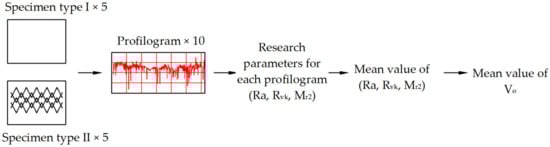 Five roughness profilograms were obtained for each test specimen, in order to eliminate the influence of random factors on the measurement results for the surface roughness parameters.