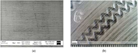 Photographs of specimen surfaces from steel 17G1S during finishing operations of the technological process: (a) after rolling; (b) ball burnishing, with the formation of a regular microrelief.