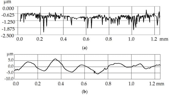 Two surfaces obtained after (Figure 5a) finishing operations of rolling and (Figure 5b) fine-turning, with the formation of a regular microrelief, were compared. These were typical working surfaces of hydraulic and pneumatic cylinder liners and other parts, which are extremely hard to machine using traditional methods because of their design features.