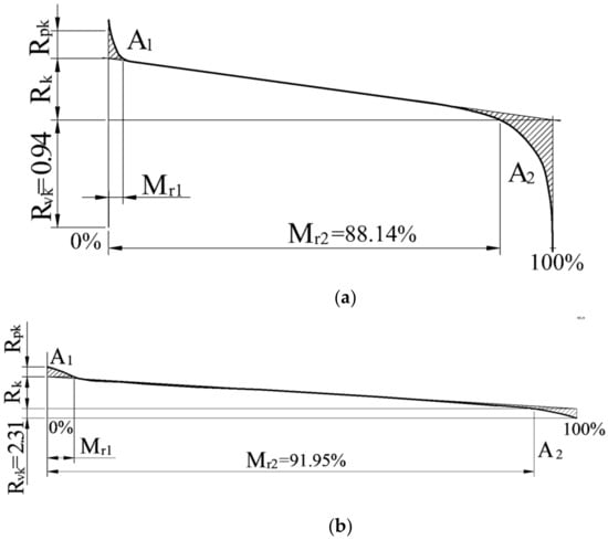 Abbott–Firestone diagram for the inner cylindrical surface of the specimen obtained after finishing operations of: (a)—after rolling; (b)—after fine turning, with the formation of a regular microrelief, Rpk is the reduced peak height; Rk is the profile core depth; Rvk is the reduced valley depth; Mr1 is the percentage of material, separated by a line that divides the peak from the profile core; Mr2 is the percentage of material, separated by a line that divides the valley from the profile midline.
