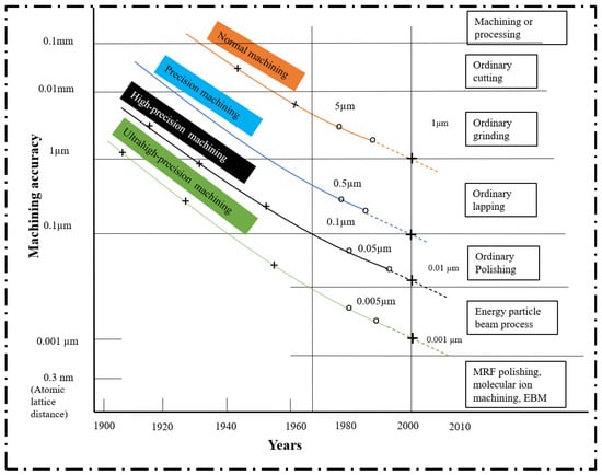 With the growing need for semiconductors, optics and aviation, ultraprecision and microfabrication facilities are becoming very important [5]. The components fabricated from these facilities have minor features, high tolerances, consume less power, and occupy very little space. The increasing demand for precision machining was addressed in the early 1980s by Taniguchi, thus giving a road map for the smallest achievable accuracy with the so-called Taniguchi curve [6]. The exponential improvements in machining accuracy are shown in Figure 1.