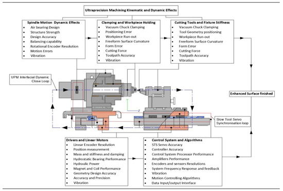 With the advancements in the manufacturing science and instrumentation domain, the definition of precision machining is continuously being updated. Ultraprecision machining (UPM) is essential to obtain the highest form accuracy and surface quality, which typically does not need additional finishing [9,10]. UPM is also called diamond turning, where a single crystal diamond tool is employed, and by which a nanometric surface finish can be obtained; the key components of a diamond turning system are shown in Figure 2. Since the latter half of the 1990s [11], there has been a large amount of research on UPM, also called diamond turning is typically a single point turning process, which emerged as a promising technology used for optics manufacturing, including high value components such as aluminum mirrors, aspheric optics, head-up display devices, and ophthalmic freeform surfaces [12]. UPM is used for machining different kinds of materials that are difficult to machine using conventional techniques and materials such as silicon, germanium, chalcogenides, and others. The proper selection of machining parameters is essential to achieve the nanometric surface finish.