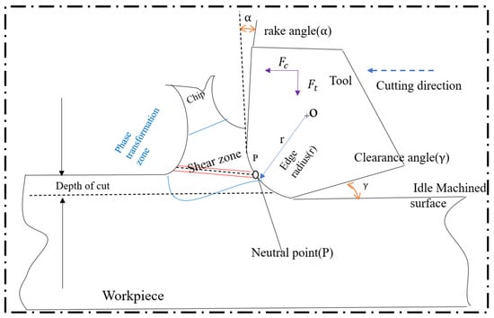 In UPM, unlike traditional machining, the depth of the cut is of the same order of magnitude as the cutting-edge radius, and this directly affects the surface finish. As the uncut chip thickness is smaller than the edge radii while machining, the effective rake angle becomes negative, even though the nominal rake angle is positive. The point at which the material separation occurs is known as stagnation or neutral point (P); the schematic diagram of the tool–workpiece contact zone is shown in Figure 3. The material above the neutral point flows upwards with a shearing effect. The material below the neutral point flows beneath the edge, causing plowing effects. The effect of plowing is very significant at lower depths, and this effect will deteriorate the surface roughness. The stagnation or neutral point is influenced by friction, which influences the temperature between the tool and workpiece [22]. Zhou and colleagues suggested that the nose radius has a considerable effect on tool wear, which will influence the surface finish [23]. The earlier research by Yan and colleagues found that a tool with a bigger nose radius gives a better surface finish in comparison to a smaller radius [24], and stated that the effects of microchipping and tool wear are significant in UPM.