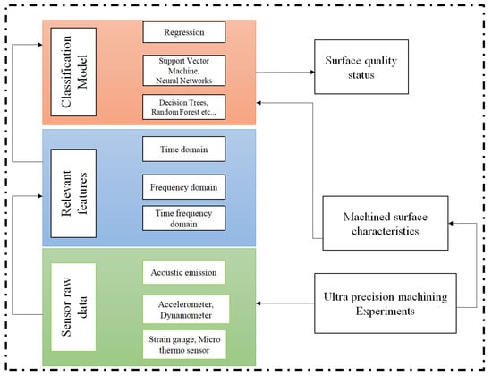 As a result, comprehending insurmountable complexity, which is suggestive of non-linear chaotic dynamics, is difficult. Therefore, it is clear that UPM is exceedingly sensitive to minute instabilities. It is worth noting that little changes in process conditions can manifest in the output. Some of the insignificant factors, such as radiation from the human body of the operator, vibration from adjacent machinery, perturbation from the closing and opening of machine doors, show their ill effects on the surface. The nascent process drift produces irrevocable defects in UPM. Thus, monitoring these factors is incredibly important. If abnormalities are not discovered early on, the substrate will be wasted. Through numerous investigations, researchers attempted to address the quality and cutting performance concerns through in-process measurement and monitoring of the cutting temperature by using improved smart cutting tools [51,52]. Data fusion techniques from different signals extracted from the sensors, along with machine learning algorithms, have shown promising results for the future. Incipient anomaly detection emerged as a pertinent engineering problem that has been studied. Machine learning algorithms enable machines to learn, improve, and execute tasks without having to be explicitly programmed. These improvements in industrial analytics, which are enabled by machine learning, will aid in the reduction of operating expenses.
