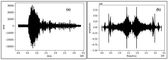 For the signals encountered in real-time, the time domain analysis is not sufficient to extract the relevant information promptly. It is necessary to transform it to the frequency domain. Fourier transformations have been used extensively in conjunction with filtering techniques [61]. The time domain and frequency of vibration signals obtained from UPM are shown in Figure 7. The effectiveness of the Fourier transformation depends on the signal containing different frequency bands. If the feature components are spread over a wide spectrum, it is tricky to use Fourier transformation. Fourier transformation reveals the frequency components of time series by transforming the time domain signal to the frequency domain. However, this analysis does not reveal how the signal frequency content varies with time; in addition, this technique is not suitable for analyzing non-stationary signals.