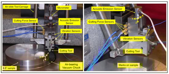 Acoustic Emission (AE) is the most popular sensor equipped for surface roughness monitoring in diamond turning. AE signals are the transient elastic waves generated from the rapid release of energy from one or more sources within the material [53]. These elastic waves contain direct information from the cutting zones in machining. Therefore, acoustic emission can detect many phenomena, including friction between the tool and workpiece, residual stresses, plastic deformation, friction on the rake face, and chip breakage. The proximity of the source of acoustic emission can alter the signal, being that the closer it is, the greater the attenuation. In precision machining, AE sensors are ideally suited for applications where subtle changes occur, such as surface finish and subsurface damage.
