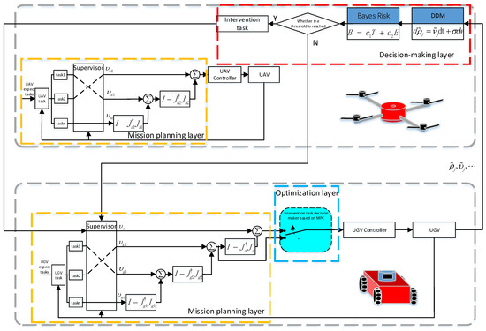 To solve the potential decision-making/planning/control conflicts, the null space behavior control (NSBC) method is one of the potential solutions, where different basic tasks for UAVs and UGVs are defined as behaviors with assigned priority. This method ensures that, under the premise of the complete execution of high-priority tasks, the partial execution of secondary tasks is possible [16]. An air-ground cooperative formation method based on the NSBC has been proposed to ensure that the formation shape can be maintained when UGVs or UAVs encountered obstacles [17,18,19]. A new type of human decision-making behavior model has been proposed in the framework of the NSBC using an event-triggered mechanism [20]. The human intervention task, with the highest priority, is triggered only when defined decision variables reach a threshold. It reduces the burden of communication and computation by intervening robots in an event-triggered way and enables human assistance to complete tasks beyond robots’ own capabilities. However, the existing methods cannot avoid risks brought on by bad or malignant interventions from either humans or UAVs.
