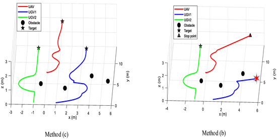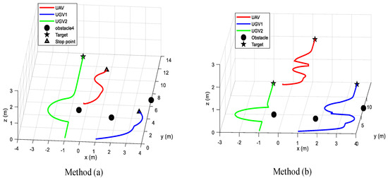 In this case, the effective intervention of UAV is verified by comparing method (a) and method (b). In the process of UGV performing tasks, there may be situations in which they cannot rely on their own intelligence to solve problems. For example, when a UGV faces two obstacles and performs an obstacle avoidance task, the sum of the speed vectors of the two obstacle avoidance tasks will have the same magnitude as the speed vector moving to the target point, but the direction will be opposite, which makes it stuck in the local minima point. Trajectory diagram of the air-ground system with no intervention measures taken by UAV and effective intervention measures taken by UAV shown in Figure 3.