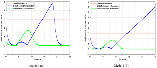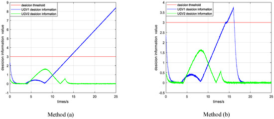 In method (a), the UGV2 can complete the task by virtue of its own intelligence. Since the UAV did not effectively intervene in the UGV1, the UGV1 fell into a minimum value at (3.3 m, 5.1 m). The UAV’s decision variable for UGV1 keeps increasing until it exceeds the decision threshold, but the intervention task is not triggered. Through the effective intervention of UAV in method (b) at time 14.45 s, after the decision variable of UGV1 exceeds the threshold, it will fall back below the threshold after 1.7 s. It shows that, after the effective intervention of the UAV, the UGV1 has been able to complete the task with its own intelligence. The decision variables of the UAV are shown in Figure 4.