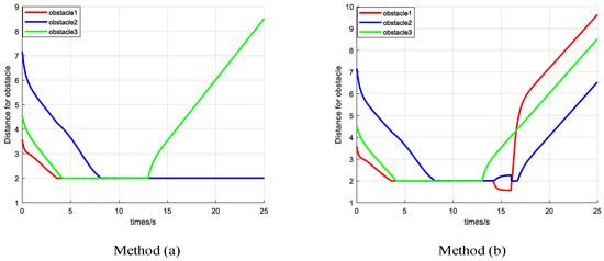 The figure shows the distance between the UGV and the obstacle in method (a) and method (b).