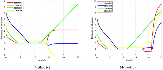 The figure shows the distance between the UGV and the obstacle in method (c) and method (b).