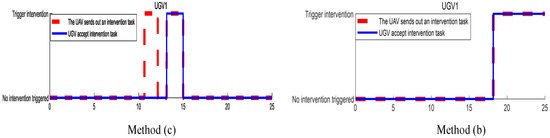Figure 6 shows that in method (b), only when the decision variable reaches the decision threshold, will the UAV launch an intervention task. After the MPC intervention task decision maker, the UGV chooses to accept the intervention task. Method (a): Since it does not involve event triggering, it is not shown here.