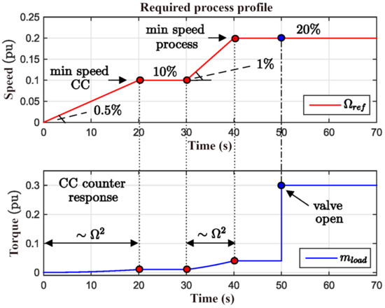 Let us consider for this analysis that the system should follow the speed profile shown in Figure 2. Two steady-state values are considered for testing purpose: 10% and 20% of the rated speed Ωrat. Furthermore, let us assume a non-linear load torque characteristic affecting the CC: it follows .
