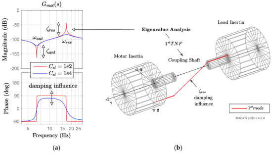 Equation (2) can be rewritten as in (4), where the main mechanical parameters that characterize the elasticity of the drive shaft are identified: the resonance parameters ζres, ωres, and the anti-resonance parameters ζant, ωant.