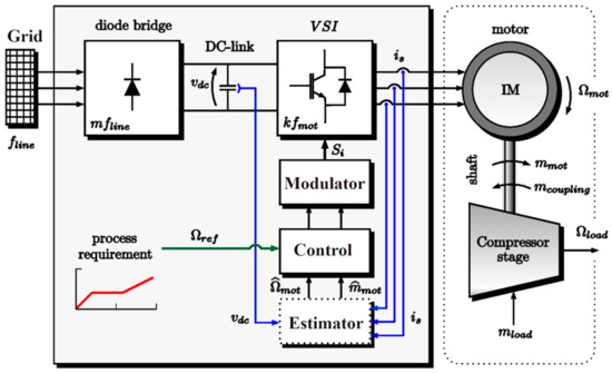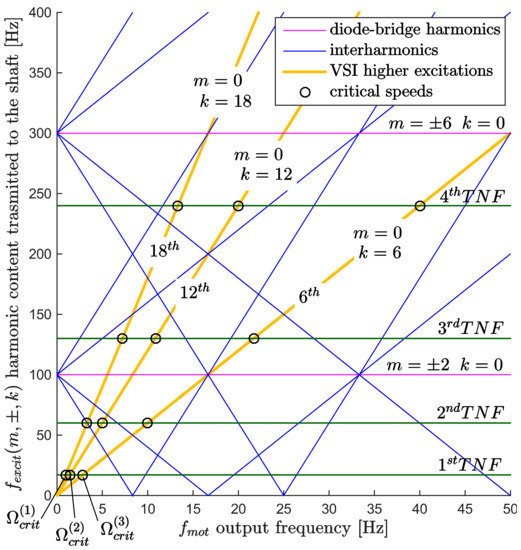 An electrical scheme overview of the motor drive is shown in Figure 4. As discussed in [4,11], the AC-DC-AC stage produces integer harmonics and interharmonics in torque (referred to DC-link coupling). The overall excitation content transferred to the shaft line is computed in (5), as a function of the motor speed and supply frequency. m, k are integer multipliers according to the following cases: