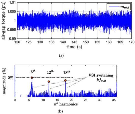 Motor torque harmonic content. (a) Air-gap torque time behavior; (b) air-gap torque harmonics contents.