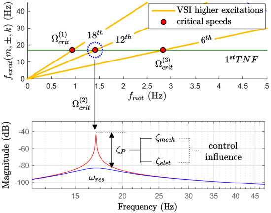 Furthermore, due to the VSD closed-loop integration, the actual damping factor at each Ω(i)crit is a combination of the mechanical one given by the shaft proprieties ζmech and the electrical damping ζelet mainly given by the electrical motor damping ζmot [14]. The control strategy defines the contributions of each term, and it is possible to analyze this effect with a more general definition of an overall process damping coefficient ζP, as shown in Figure 7 and given in (7).