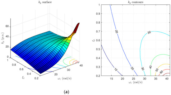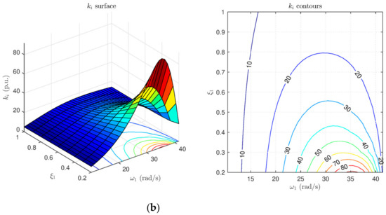 - Choosing the pole-pair p1,2 as the dominant ones, as it follows ω1 < ω2. A fast closed-loop dynamic is guaranteed by settling the frequency boundaries according to ωant as given in (17). In addition, ζ1 should be high in order to have R(s) robustly stable on load torque rejection. The coefficients of p1,2 ⇒ (ω1, ζ1) are chosen through the gains counter plots in Figure 10, then kp, and ki are selected, focusing on the linear parts of the surface.