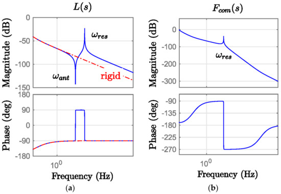 Bode diagram with kp = 10 and ki = 6.5. (a) Open-loop transfer function L(s) Bode diagram; (b) command-tracking transfer function Fcom(s) Bode diagram. Red lines represent rigid behavior.