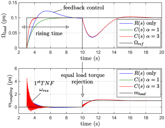 Once again, the speed step response at constant torque Ωload = 0.1, mload = 0 is evaluated. The benefits of a 2DOF strategy compared with the original regulator R(s) are shown in Figure 13, especially for α = 1 it is possible to mitigate the overshoot, while a higher α decreases the rising time with higher overshoot.
