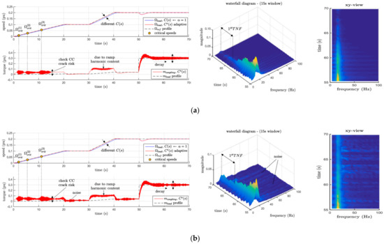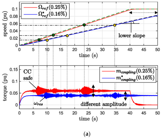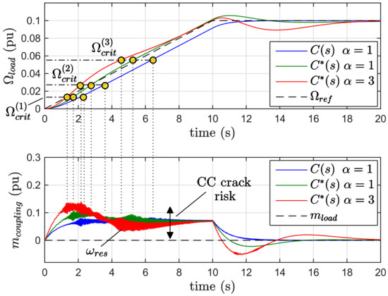 The CC reference profile given in Figure 2 is evaluated with different C(s) and C*(s), as shown in Figure 20. The simulation agrees with the HIL results: there are similar torsional vibrations in terms of amplitude and time–decay both on critical speed crossings and step responses. The torque mcoupling constraint is respected due to a speed ramp of 0.5% and 1%, respectively, validating the early analyzed approach. The process damping is ζP(7 ms) ≅ 0.3. For effective simulations, an additional white noise generator should be added because the HIL presents a greater noise than actual simulation, i.e., due to hardware implementation delays. Comparison between HIL and simulation results are reported in Table 4.