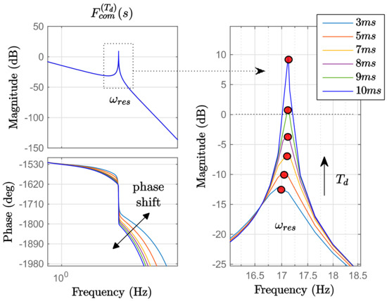 ζelet and ωelet can be computed from an FEM analysis of the electrical side only [2,26,29]. Usually, in CC trains ζelet is negligible compared with ζmech, which is higher due to large Jmot, Jload. In addition, ωelet is located at higher frequency, on the contrary to ωmech. However, even without changes in the electrical or mechanical parts, ζP changes because the control strategy affects the impact of ζmech, ζelet. Considering the latency effect of Td, from (19), it follows (32):