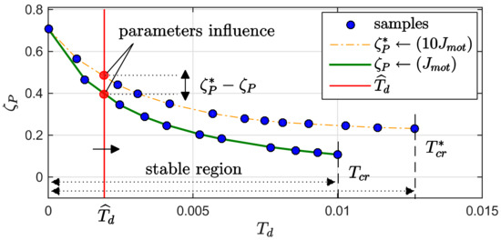 where ζP(Td) is computed using a polynomial curve fitting from samples of (34), changing Td = 0, …, Tcr inside the stable region, as shown in Figure 18. This approach allows us to consider the electrical and mechanical design, in addition to the control topology. For example, changing the motor inertia to Jmot * = 10 Jmot, this follows ω*res ≠ ωres and the stability boundary increases from Tcr to T*cr. As shown in Figure 18, with the same amount of delay, ζ*P (Td) is less sensitive to Td.