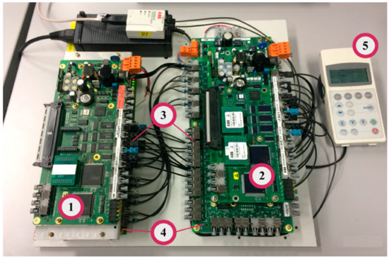 The experimental setup consists of a HIL in a master–slave configuration. A master board is used to implement the control algorithm, and dynamic models for VSI (the DC-link is assumed constant), motor and estimator units. The control algorithm is partially translated from MATLAB/Simulink into C-code, and completed with an assembly-code, then compiled onto a Motorola DSP 24-bit word. A slave board is used to implement the mechanical model, process boundaries and load a torque profile. The boards allow four sampling times Ts from 25 μs to 2 ms, used for backward-discretization. The most sensitive operations are computed at the highest Ts. The communications are based on fibre-optic links. This HIL provides a rapid prototyping platform to test the different speed profiles earlier analyzed in simulation. An overview is shown in Figure 19.
