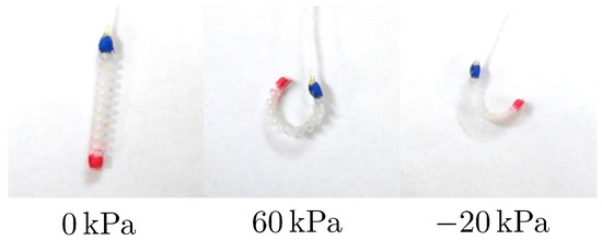 The overall appearance and a side view of the actuator are shown in Figure 1 [11]. The shape of the actuator is a semicircular cylinder with a bellowed structure on one side and a flat surface on the other side [11]. This structure makes it possible to bend in two directions without using the fiber-reinforced rubber. In addition, the elasticity of the bellowed structure is greater than that of fiber-reinforced rubber; therefore, it can be bent more greatly than the fiber-reinforced rubber actuator [12]. Figure 2 shows the bending motion of the actuator [13]. When positive pressure is applied, the bellows side tends to expand, and the flat side does not expand easily; therefore, the actuator bends with its bellows outside (at 60 kPa in Figure 2). On the contrary, when negative pressure is applied, the bellows side is easy to contract, and the flat side is hard to contract; thus, the actuator bends with its bellows inside (at −20 kPa in Figure 2).