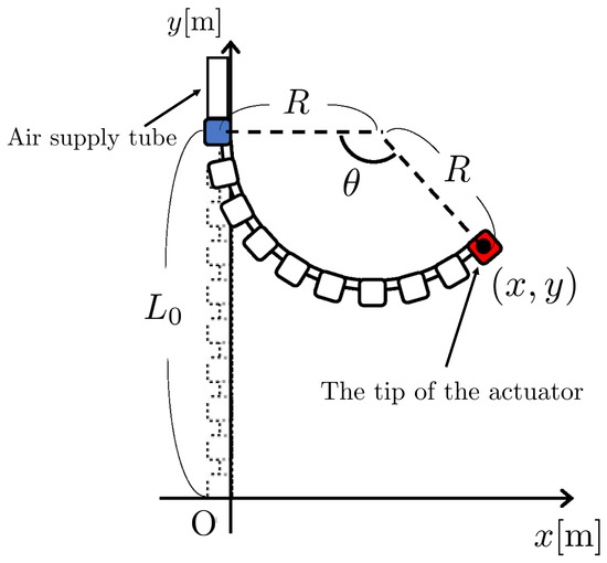The model of the actuator has been proposed for controlling the position of the tip (see details in [13]). As shown in Figure 3, it is supposed that the actuator curves in an arc [13]. Additionally, the bending angle , the curvature radius R, and the length of the actuator L are defined. The origin of the coordinate system is the tip of the actuator in the initial state. The is the coordinate of the tip of the actuator when air pressure is applied. The coordinates of the tip of the actuator at the time of deformation are determined by R and . R and are replaced with x and y geometrically.