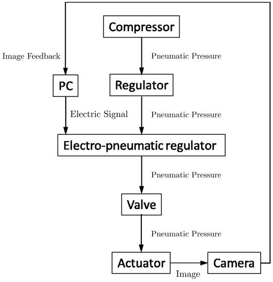 Figure 8 shows the experimental system and Figure 9 shows the experimental flow [13,14]. The experimental system consisted of the actuator, an air compressor (DPP-AYAD, Koganei, Tokyo, Japan), a safety regulator (RP1000-8-07, CKD, Aichi, Japan), an electro-pneumatic regulator (ITV0010-0CS, SMC, Tokyo, Japan) providing air pressure for the actuator, a camera(HD Pro Webcam C920r, Logicool, Tokyo, Japan) measuring the output of the actuator, and a computer sending an electrical signal. The bending angle was measured by acquiring and processing images with a camera. The tip of the actuator was colored red and the base was colored blue. Then, the red region and the blue region were extracted from the image taken by a camera, and the bending angle was calculated from the relationship between the two regions. The following explains how to move the actuator.