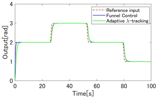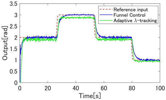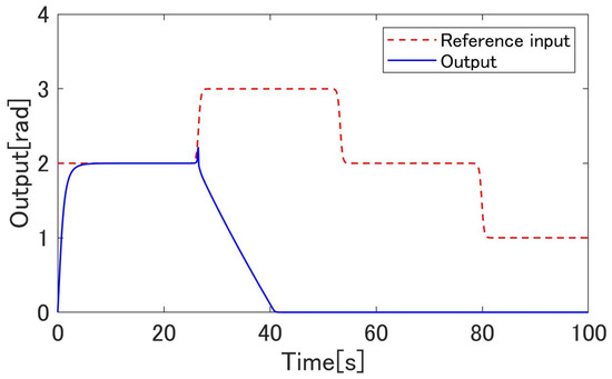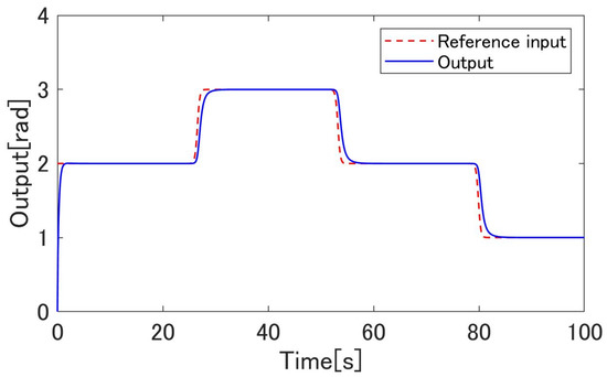 Figure 10, Figure 11, Figure 12, Figure 13, Figure 14, Figure 15, Figure 16, Figure 17, Figure 18 and Figure 19 show the simulation results. Figure 11 shows the result of the proposed method and confirms that the output angle of the actuator follows the target value. Figure 12 and Figure 13 show that the error is inside the boundary function. As shown in Figure 14, the proposed method can follow the output angle to the target value faster than the previous method [23]. From Figure 15 and Figure 16, the gain increases whenever the target value changes in the previous method using adaptive -tracking control, whereas the gain increases and decreases and remains constant after the actuator follows the target value in the proposed method. Figure 17 shows that the derivative of the storage function is less than the supply rate and confirms that the proposed system satisfies the passivity. To compare the proposed method with a conventional boundary function which is fixed, Figure 18 and Figure 19 show the results of the method without using the observers. Figure 18 shows that the output angle does not follow the desired value when the value changes. Figure 19 shows that the error deviates from the boundary function. These results show the effectiveness of the proposed design scheme.