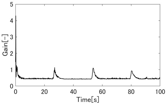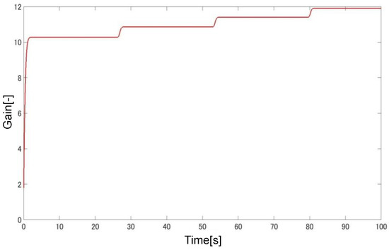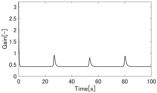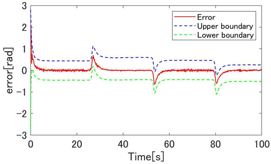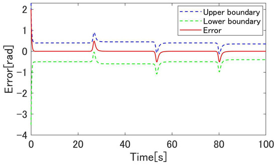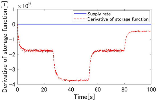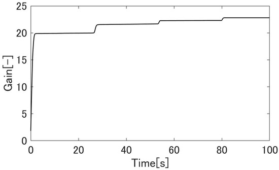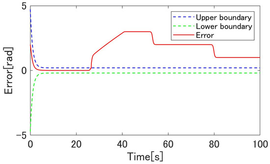 Figure 20, Figure 21, Figure 22, Figure 23, Figure 24, Figure 25, Figure 26, Figure 27 and Figure 28 show the experimental results. Figure 20 shows the result of the proposed method and confirms that the output angle follows the target value. From Figure 22 and Figure 23, the controlled deviation is inside the boundary function. Figure 24 shows that the proposed method can follow the output angle to the target value faster than the previous method [23]. Additionally, the proposed method has a smaller steady-state error than the previous method. Figure 25 shows that the gain increases whenever the target value changes in the previous method using adaptive -tracking control. In contrast, Figure 26 shows that the gain increases and decreases and remains constant after the actuator follows the target value in the proposed method. Figure 27 shows that the derivative of the storage function is less than the supply rate and confirms that the proposed system is passive. Figure 28 shows that the proposed system satisfies the robust stability, as shown in Equation (24). These results show the effectiveness of the proposed method.