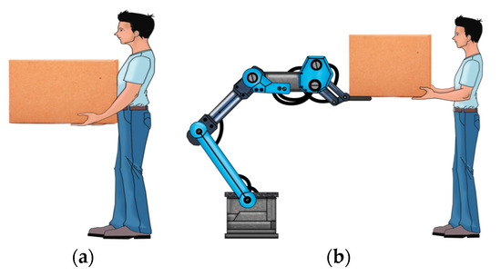 Workers in various industries always need to handle heavy and large materials and objects. For example, they handle materials/objects for (i) loading/unloading heavy and large luggage, bags, and so forth to and from buses, trains, trucks, aircrafts, ships, and so forth for logistics and transport; (ii) handling heavy and large bags, objects, materials, and so forth in various industries, such as agriculture, forestry, automobile, mining, shipbuilding/breaking, military activities, manufacturing/assembly, timber, construction, and so forth. However, handling heavy and large materials and objects manually is usually hard, time-consuming, and tiresome; and it may reduce work efficiency and also cause injuries, back pains, musculoskeletal disorders/malfunctions, and so forth to concerned workers, especially sick, unskilled, novice, aged, and weak workers [1]. On the other hand, various autonomous robotic devices for handling large and heavy objects, such as cranes, may not provide the expected level of flexibility in manipulation [2]. Hence, we posit that suitable robotic systems/devices with human intervention/involvement, such as power assist robotic systems, may be the most suitable for handling heavy and large objects in relevant industries, especially in industries with unstructured environments [3]. In such a case, the strength of a robotic system and the intelligence of a human coworker may jointly make the human–robot collaborative system far superior to an individual robotic system or a human [4]. However, currently, power assist robotic systems are mostly used for assistive, healthcare, and rehabilitation purposes [5,6]. We thus posit that diversifications and novelty in power assist applications can be brought if power assist robotic systems are proposed to be used to manipulate heavy and large objects in various industries [7]. However, such human-friendly power assist robotic devices have not been enormously employed in the mentioned industries yet.