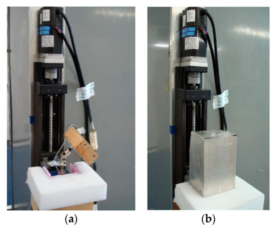 We designed and built a 1-DoF (vertical lifting motion) power assist system using a ball screw, which was actuated by an AC servomotor (see Table 1 and Table 2 for details of the servomotor and the ball screw, respectively). We also mounted a noise filter to prevent electrical noises from the power supply to the servo system. We coaxially fixed the servomotor and the ball screw on a metal plate and then vertically attached the plate to a wall, as shown in Figure 2a. The ball screw converted the rotary motion of the servomotor to the linear motion. As shown in Figure 2a, we attached a force sensor (see Table 3 for details) to the ball nut of the ball screw through an acrylic resin block. We tied one end of a universal joint to the force sensor and attached the other end to a wooden block. We lubricated the ball screw properly to enhance its efficiency and life. We used light machine oil and sometimes high-pressure grease for lubrication. We kept the backlash as minimum as possible in the ball screw and also kept it almost free from contamination by wiping it out properly.