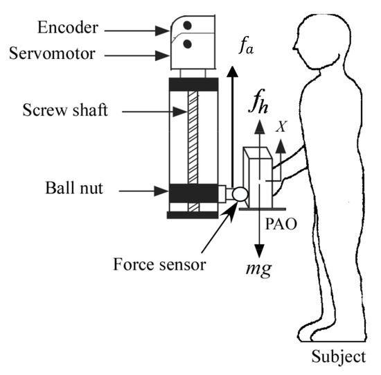 The m would be the object’s mass value used to simulate the power assist system for lifting different objects if the issue of weight perception was not to be considered (this is the usual case as in Equation (2)). However, m2 was the mass value used for the gravitational force for simulating the power assist robotic system for lifting different objects when the issue of weight perception was to be considered (novelty in our case as in Equation (3)). We called m2 as the “simulated weight” of the object when the issue of weight perception was considered.