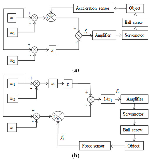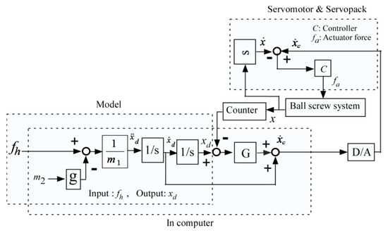The load force (LF) symbolized by fh is not included in dynamics scheme/model 2 in Equation (6). Therefore, it is not required to use a force sensor for the design of the force control for the assist system considering this model of dynamics. It can be termed as the force sensorless scheme of force control [21]. However, we may require an acceleration sensor for this type of force control scheme. To do so, we can measure x (actual displacement of the object) using the servomotor’s encoder and then derive the acceleration () from x. This derivation may be found noisy. Therefore, it seems to be necessary to use an acceleration sensor for the design of the force control scheme using this dynamics model. The force control model developed considering Equation (6) is exhibited in Figure 6a.