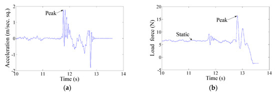 The sample acceleration data (for force control scheme/method 1) and the sample load force data (for force control scheme/method 2) are shown in Figure 7. For the load force data, the simulated weight of the object is the static force, which is about 5 N because m2 = 0.5 kg. However, the figure shows a slightly higher static force (>5 N) probably because the human hand was not stationary while holding the object. Again, the peak load force (PLF) (about 17 N) is close to the mean visually perceived weight (1.98 kg or about 19 N), which reveals that the feedforward load force is applied based on the visually perceived weight, which is in line with what we assumed in Section 1 [20]. The PLF is about 17 N, but the static force (the actually required load force to lift the object [20]) is about 5 N, which reveals that the human usually applies excessive load force when lifting the object.
