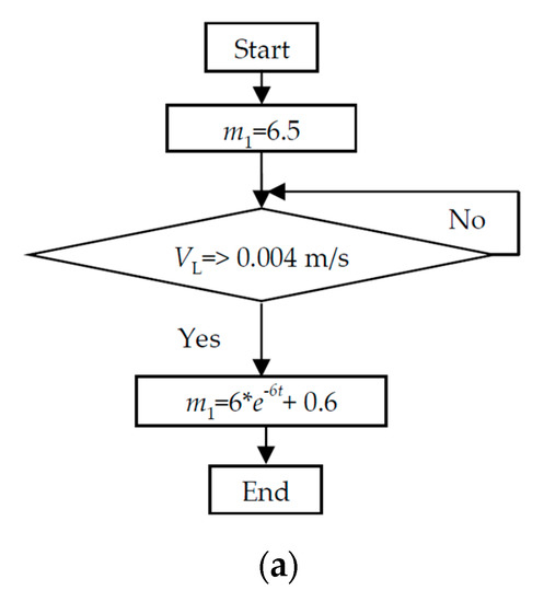 We performed experiment 2 with the aim of reducing excessive PLFs and peak accelerations by applying another innovative adaptive control technique/strategy. We previously observed in [7] that PLF magnitudes are to be linearly proportional to m1 values, but human users usually do not feel such changes in m1. Hence, the novel adaptive control strategy that we derived was such that the value of m1 should exponentially decline from a large value (say, m1 = 6.5) to a small value of m1 (say, m1 = 0.6) when the subject lifts the PAO with the assist system and the lifting velocity (e.g., VL) of the PAO exceeds a threshold. The reduction in m1 would reduce the PLFs (and accelerations) proportionally as m1 was linearly proportional to the PLFs [7]. Furthermore, the reduction in PLFs would not have an adverse impact on the relationships expressed in Equation (3) because a human user would not feel any changes in m1 [7]. Therefore, the novel adaptive control strategy defined by the following two equations for m1 and m2 may be adopted. Figure 8 diagrams the novel adaptive control algorithm/strategy as a flowchart.