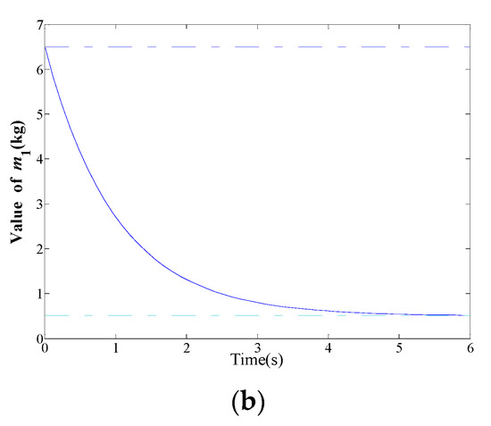 The inclusion of a human user’s weight perception in the robot dynamics here means that the perceived weight due to the inertia is expected to differ from that due to the gravity while an object is being lifted by a user with the power assist robotic system. It may happen because the visually perceived weight is different from the haptically perceived weight. Thus, we here assume that the mass parameter used in the inertial force may be different from that in the gravitational force in Equation (2) [31], which is reflected in Equation (3). In Equation (3), m1 is the mass parameter for the inertial force and m2 is the mass parameter for the gravitational force, and we assume that , , . We then derived dynamics models for the system in three different ways as follows:
