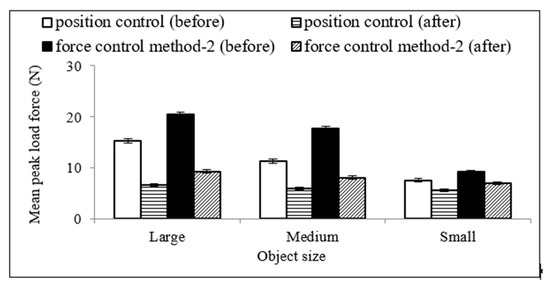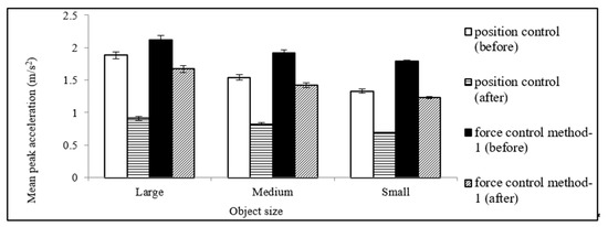 We determined the mean PLF and peak acceleration for each size object for the position control scheme, the mean peak acceleration for each size object for force control scheme/method 1, and the mean PLF for each size object for force control scheme/method 2 for experiment 2 (after the implementation of the novel adaptive control strategy/algorithm), and compared them with those of experiment 1 (before the implementation of the novel adaptive control strategy/algorithm). The results are shown in Figure 9 and Figure 10.